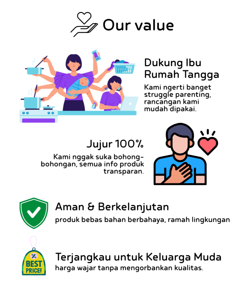 Kami lahir dari keinginan sederhana: Membantu orang tua muda seperti kamu memulai perjalanan parenting dengan produk yang aman, ramah lingkungan, dan juga hemat.